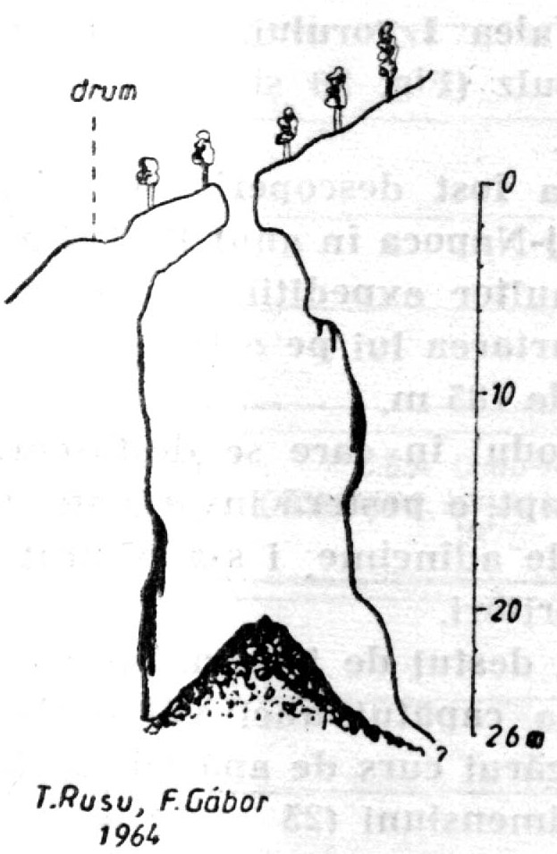 Intrarea, destul de îngustă (1,5 - 1,6 m lăţime), permite accesul într-un gol subteran de foi mă unui clopot, parţial concreţionat cu o lăţime ce variază între 6—10 m. După o coborîre în surplombă de 20 m se ajunge pe vîrful unui con de dărîmături care împarte fundul avenului în două ramuri opuse ce se înfundă curînd.