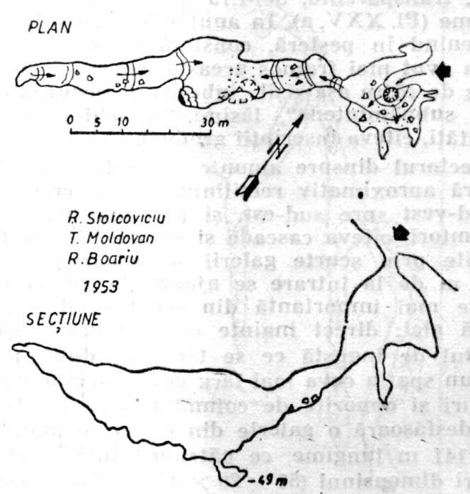 de mari dimensiuni (18 x 21 m). Spre sud-vest aceasta se transformă într-o galerie puternic descendentă care dă acces într-o a doua sală, bogat concreţionată, alungită, dezvoltată în lungul unei diaclaze. În timp ce tavanul acesteia se menţine aproximativ la aceeaşi înălţime, podeaua coboară, la început, spre gura unui puţ de 5 m adîncime după care urcă, în partea opusă, pînă în tavan.
