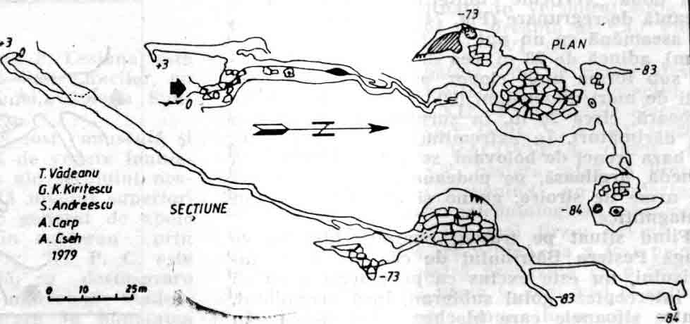 Intrarea, orientată spre sud-est, este reprezentată printr-o deschidere de 3 X 2 m care apare, într-un „fund de sac", în versantul stîng al văii primare ce continuă, spre dreapta, pînă în Valea Ponorului. Cursul de apă sub acţiunea căruia s-a format este azi temporar-activ, străbate, la început, o galerie puternic descendentă, relativ joasă, cu numeroase repezişuri şi cascade, şi dispare la capătul acesteia, printr-o strîmtoare greu accesibilă (0,5 x 0,4 ni) care a făcut pe mulţi exploratori să renunţe la înaintare. Dincolo de aceasta se pătrunde într-un sistem de trei săli, cu numeroase prăbuşiri, dintre care, cea mai mare (30 X 25 x 20 m) adăposteşte un con de dărîmături acoperite cu argilă. Din celelalte două săli extreme se ajunge, prin intermediul unor puţuri, la cele mai coborîte cote atinse pînă în prezent în această peşteră (-73, -83 şi -84 m). În tot lungul peşterii, dar mai ales în sectoarele înguste, se remarcă un puternic curent de aer ce ventilează golurile carstice, încă necunoscute, dintre. Peştera Cociului şi Peştera cu Apă de la Bulz (H. KESSLER, 1944, T. RUSU, 1976, T. VADEANU, 1981).