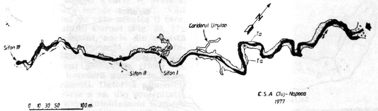 În zona primului sifon, galeria se lărgeşte spre dreapta lăsînd impresia că a luat sfîrşit. În realitate, ea continuă să se desfăşoare în lungul unei falii verticale, cu o frumoasă oglindă de ficţiune, după care, prin schimbarea structurii calcarului, care devine dolomitic, apare o nouă strîmtoare reprezentată printr-un sifon temporar deschis (II). Dincolo de acesta, se dezvoltă o galerie bogat concreţionată care, după ce descrie cîteva meandre, ia sfîrşit într-un alt sifon (HI), închis la data explorării (1977).