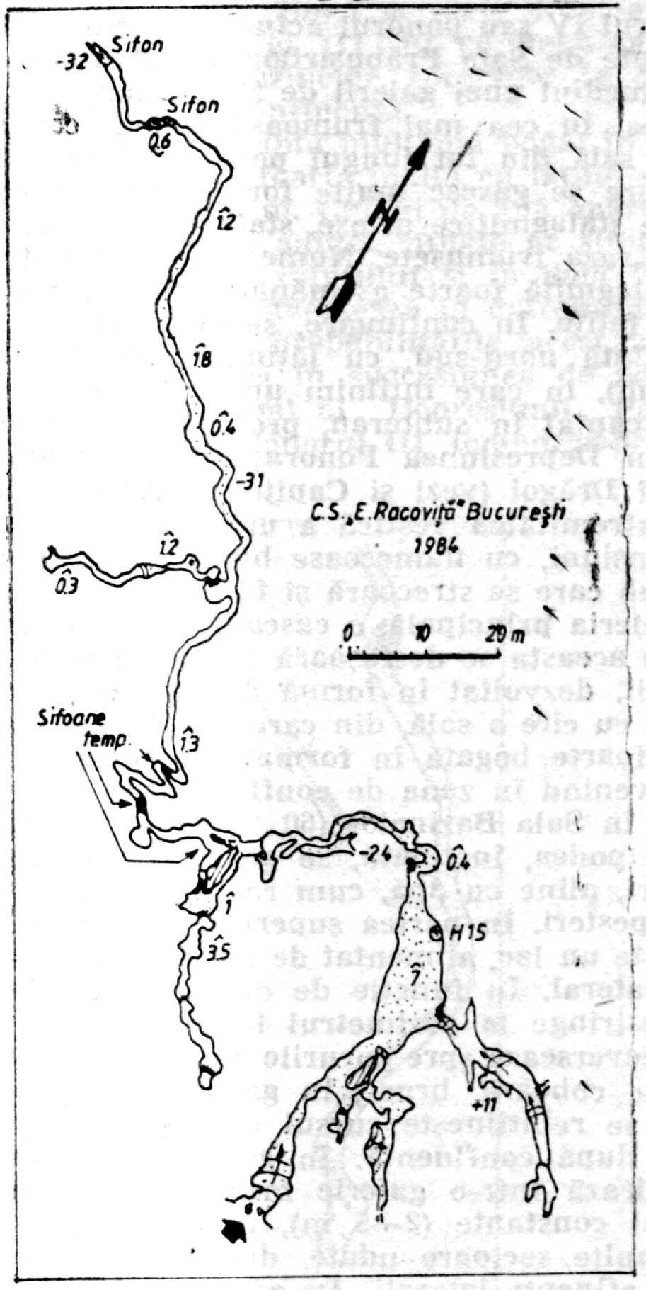 În extremitatea aval a sălii de confluenţă se pătrunde într-o galerie îngustă şi joasă (0,4 m înălţime), care coteşte brusc spre vest, şi, după circa 40 m, primeşte, din stînga, o galerie-aflu-entă, ascendentă, ce se termină în „fund de sac". Galeria principală descrie, în continuare, un traseu foarte sinuos, cu trei sifoane temporare, după care se îndreaptă spre nord-vest. Curînd, pe stînga, se desprinde un diverticul suspendat care se înfundă treptat, iar apoi peştera continuă sub forma unei galerii meandrate cu lăţimi medii de 1,5 m şi înălţimi ce variază între 0,4—1,8 m. În sectorul final, orientat est-vest, se întîlneşte un sifon temporar-închis, după care urmează un altul închis situat la —32 m faţă de intrare.