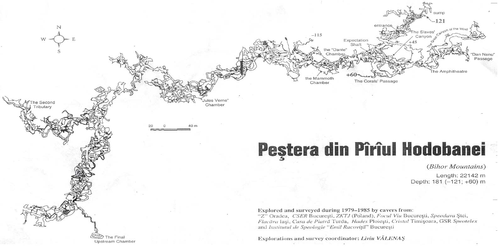Din septembrie 1979 coordonarea explorărilor este preluată de către Liviu Vălenaș. Alături de Eva Győrfi, el descoperă, cu plecare din baza Puțului Speranței, direcția principală de înaintare spre amonte. Parcurg apoi Sala Dante, urmată de Marile Meandre și se opresc în Sala Mamut, la baza unui perete. Cercetările sunt reluate în luna octombrie a aceluiași an, când L. Vălenaș, Dorel Pop, Horia Mitrofan și Nicolae Sasu descoperă un nou parcurs activ, situat sub Sala Mamut, dar din păcate fără continuare. Este descoperit și un sistem de galerii polietajat, care avea să ofere iarăși continuarea. Cu ocazia Revelionului din 1980, L. Vălenaș, Nicolae și Rodica Stoica-Negulescu și Costică Gagea (CSER București), descoperă Marele Râu, unde după un parcurs de 860 m, înaintarea le este oprită în Sala Finală, de către o cascadă înaltă de peste 20 m. În cadrul aceleiași tabere, în colaborare cu numeroși speologi de la CSER București, Flacăra Iași și ZKTJ din Polonia, sunt descoperite mai multe rețele laterale dintre care mai importante sunt Canionul Sclavilor, Marele Canion al Vântului și Galeria Dan Nanu.