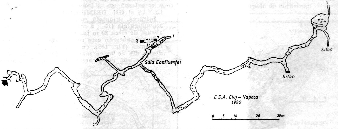 Descoperită şi cartată în 1982 de către membrii C.S.A. Cluj-Napoca, peştera îşi are intrarea la circa 50 m amonte de un puternic izvor carstic. Ea este reprezentată printr-o galerie principală, temporar-activă, cu secţiuni destul de reduse (2,5—0,7 1,5 X 3,0 m). Din galeria principală se desprind cîteva galerii secundare prin intermediul cărora se ajunge la o serie de sifoane care par să indice nivelul piezometric din masivul calcaros în care se află. În general, ea se dezvoltă aproape orizontal şi urmăreşte, în desfăşurarea sa, sistemul de fisurare a calcarului în „tablă de şah", de unde şi foarte multe schimbări de direcţie. Cele cîteva contrapante, bazine cu apă şi sifoane (permanente său temporare), precum şi prezenţa aluviunilor foarte fine din lungul peşterii, pledează că ea s-a format în regim înecat şi că, în prezent, apele tind să se retragă la un nivel inferior, de unde revin la suprafaţă, după toate probabilităţile, prin izvorul amintit.