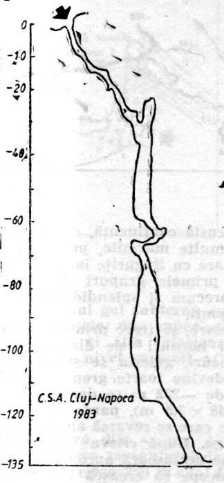 Curînd după intrare se pătrunde într-un labirint de galerii suprapuse, foarte strîmte, ce pot fi uşor evitate dacă ne angajăm pe o galerie puternic descendentă, cu cîteva rupturi de pantă, care debuşează într-un prim puţ la cota -30 m. De aici se coboară două „verticale", cu o treaptă intermediară, surplombată, aflată la -65 m, şi, în final, un al treilea puţ, de -20 m, la baza căruia se ajunge într-o galerie activă, situată la -135 m faţă de intrare.