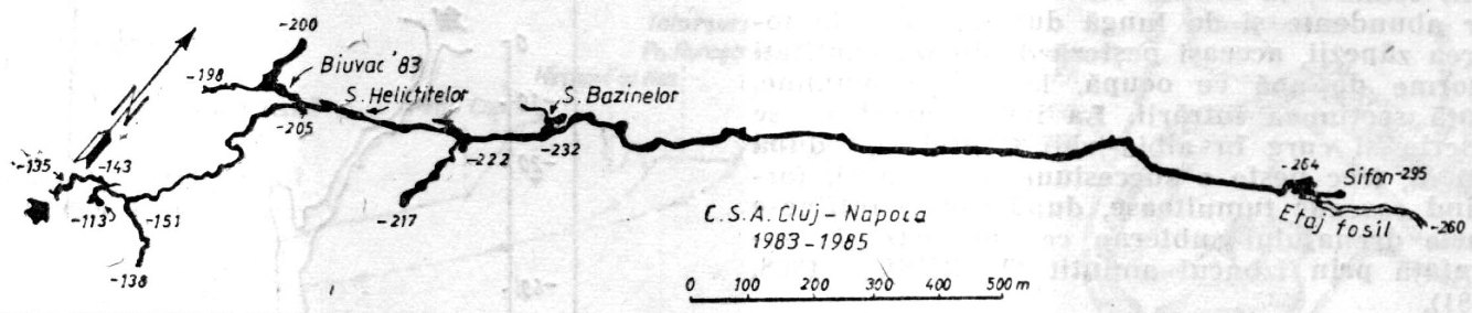 Pe primii 700 m, pînă la confluenţa cu Sala „Bivuac '83" galeria principală, spre care converg cîţiva afluenţi, prezintă un traseu meandrat, cu nivele de eroziune şi numeroase plaje de nisip şi argile. Pe anumite distanţe, ea urmăreşte feţele de strat, prezentînd şi cîteva porţiuni cu tavan plan-orizontal, avînd dimensiuni ce variază între 4 - 5 m lăţime şi 0,7- 3,0 m înălţime. De la cota -205, debitul cursului de apă se dublează datorită afluentului nr. 7.