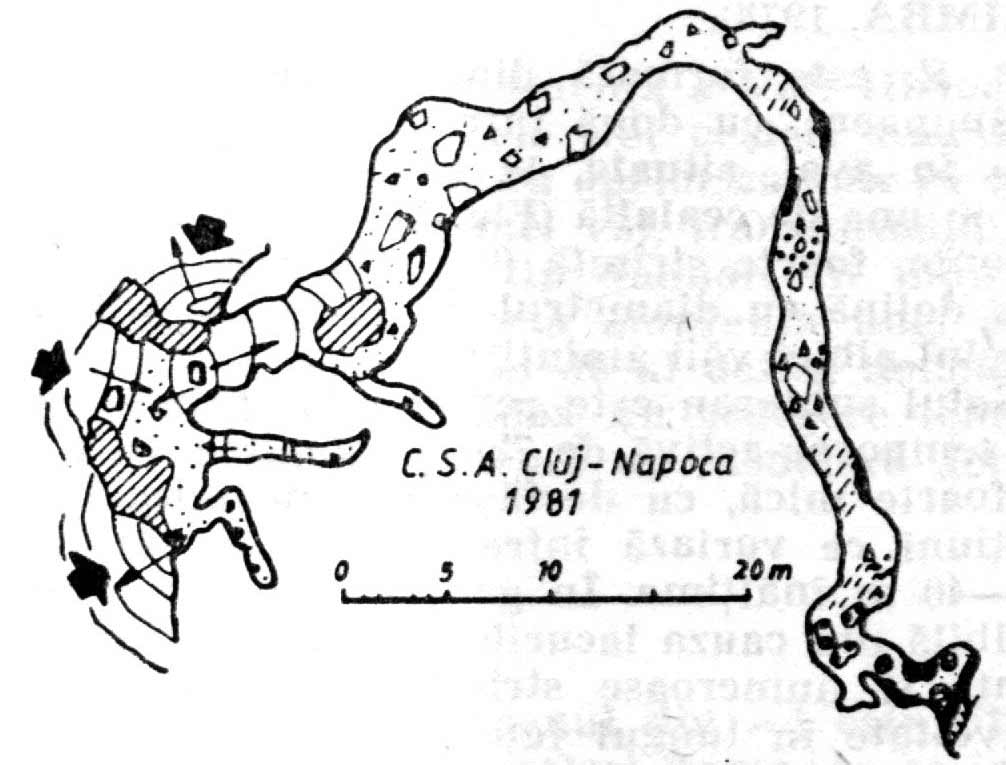 Treptat, golul subteran se îngustează pînă la 1 - 2 m, se curbează spre dreapta şi se închide prin concreţionare. Acest ultim tronson de galerie, aproape orizontală, este bogat concreţionat iar pe planşeu se găsesc resturi scheletice de Ursus spelaeus.