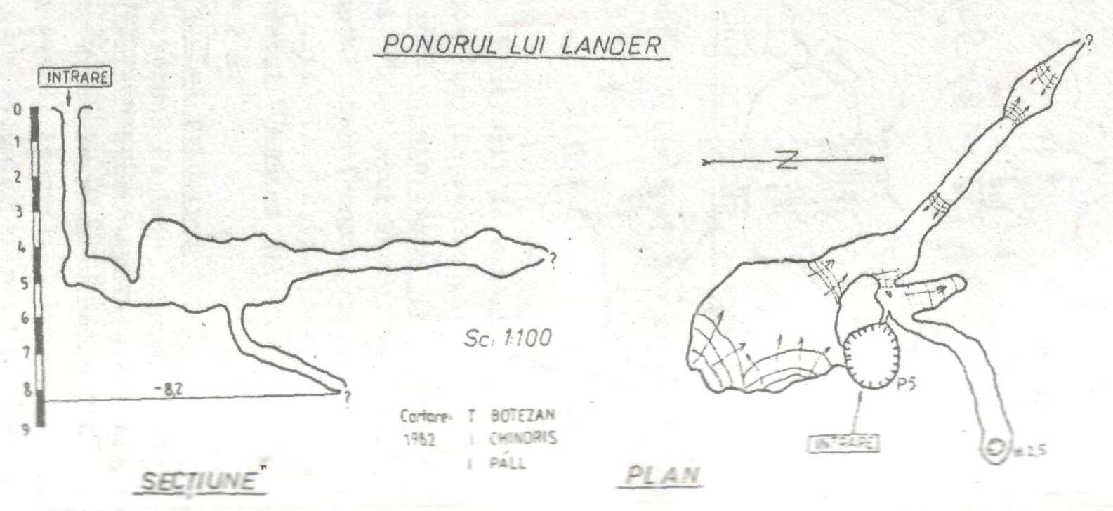 "La baza peretelui, 5 m stinga faţă de locul pierderii apelor (vezi figura) se află intrarea de dimensiuni modeste. După coborârea celor 5 m de verticală, galeria uşor descendentă îşi înalţă tavanul pentru ca după cîţiva paşi să se ramifice. Galeria din dreapta ne-a trezit interes ca orientare, îndreptîndu-se spre locul de intrare a apelor în subteran. Această galerie este orizontala , iar în capătul ei există un horn de 2,5 m. Un diverticol pe stanga, puternic descendent duce la atingerea cotei maxime de -8, această galerie comunică cu puţul de acces."